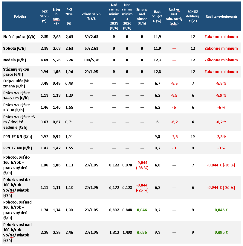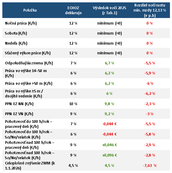 V informačných materiáloch ZO ECHOZ sa opakovane uvádzajú percentá pri príplatkoch (napr. 12 %, 10 %, 9 %, 7 %, 6 %). Pri viacerých položkách však ide o režim, kde je sadzba nastavená na úroveň zákonného minima, ktoré sa automaticky mení podľa minimálnej mzdy.