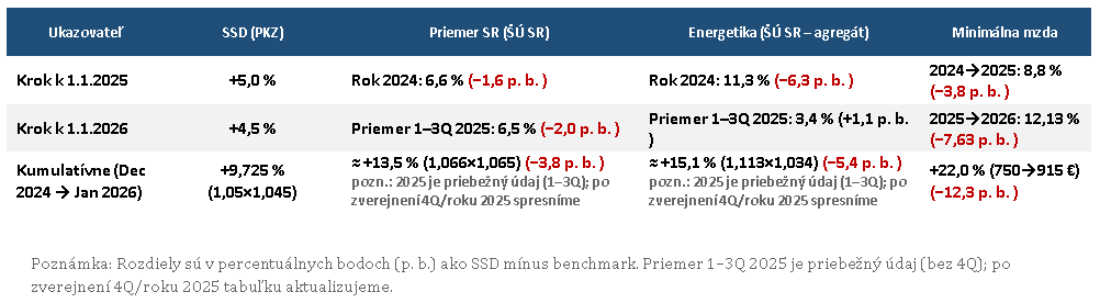 Kým SSD tarifná zložka kumulatívne rastie o +9,725 %, dostupné oficiálne údaje ukazujú vyšší trend rastu v ekonomike SR (≈ +13,5 %) aj v energetickom agregáte (≈ +15,1 %) a minimálna mzda rastie ešte rýchlejšie (+22,0 %).
